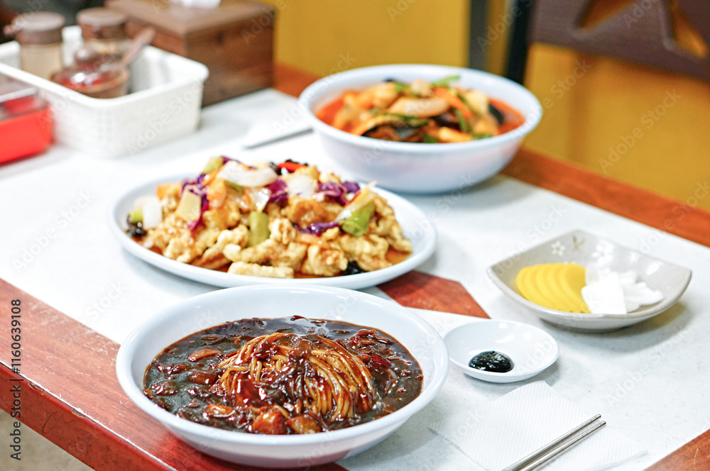 탕수육과 짬뽕이 식탁 위에 놓여 있는 모습