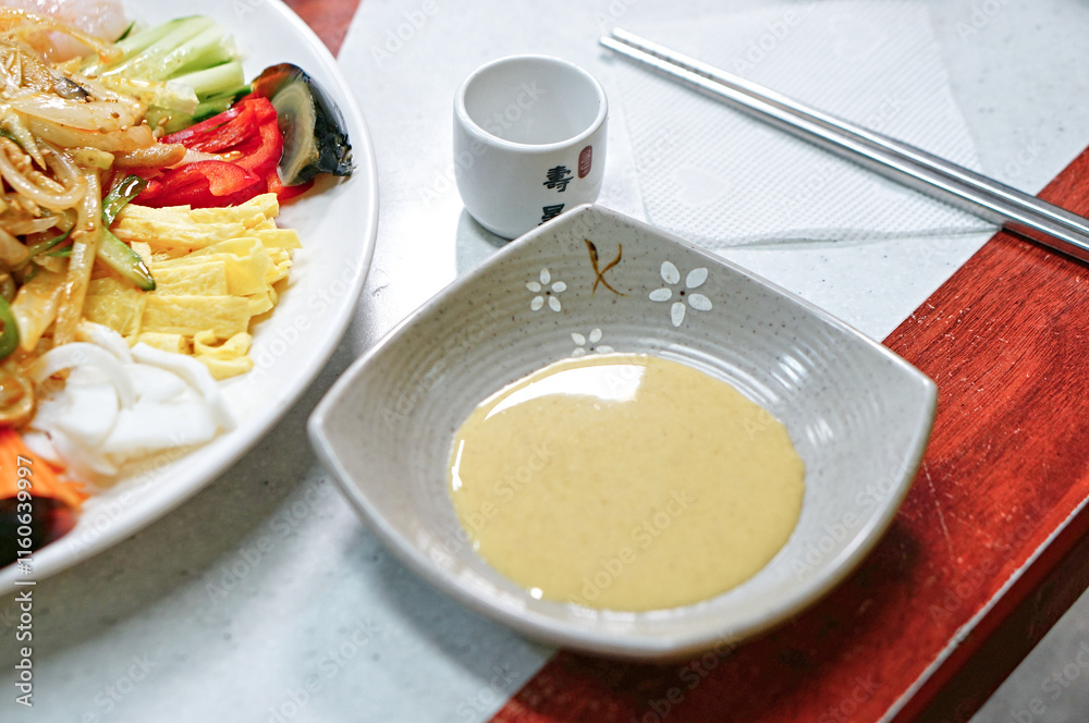 식탁 위에 놓여 있는 겨자 소스 모습