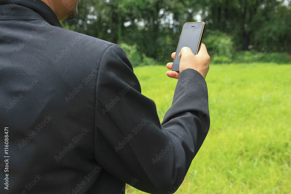 A man check smartphone on grass background