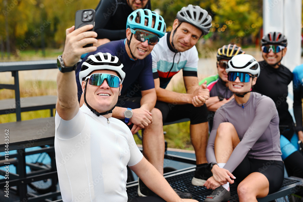 Group of athletic people with helmets and bicycles taking selfie outdoors