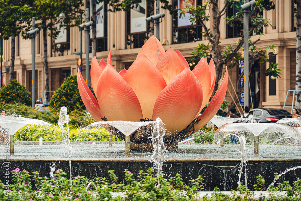 Close-up of the lotus flower and water jets at the roundabout in Nguyen Hue Street in front of the city hall in Vietnam.