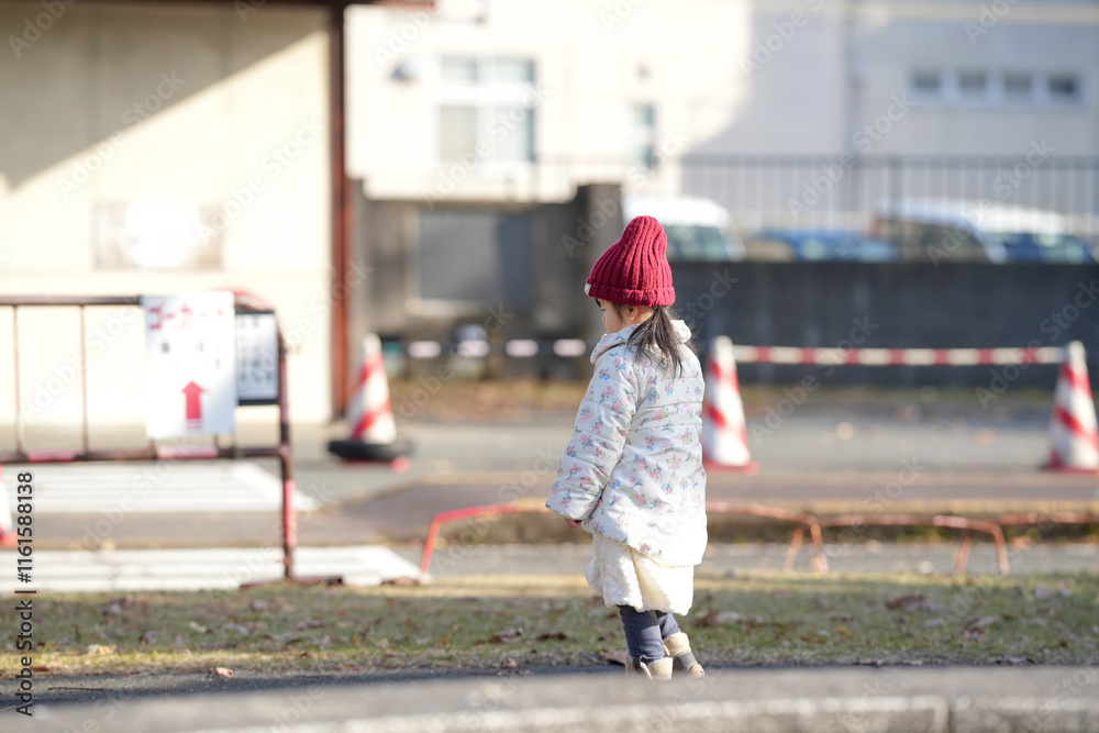 A 3-year-old Japanese girl wearing a red knitted hat and white down jacket walks through a park in Hakata, Fukuoka Prefecture on a cold winter afternoon.