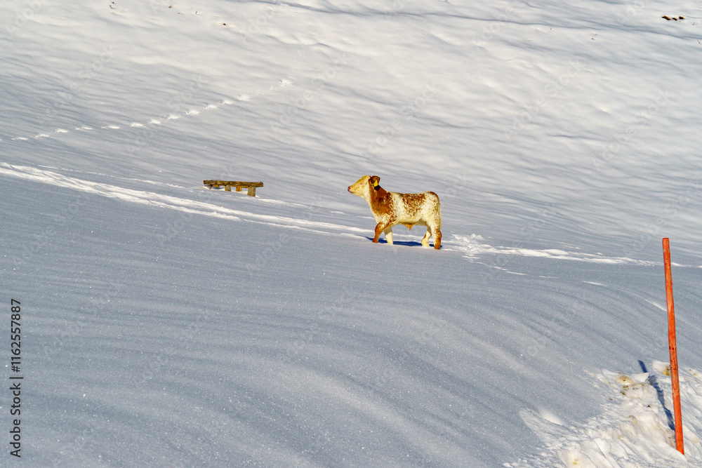 A young brown-white domestic bull (calf) in the snow