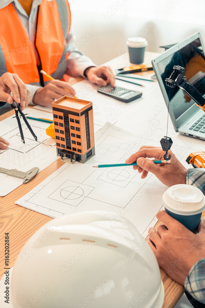 Construction concept: Engineer's hands drawing plans on blue print with architect equipment discussing floor plans over architectural plans, blueprints at table in office. Close-up vertical image