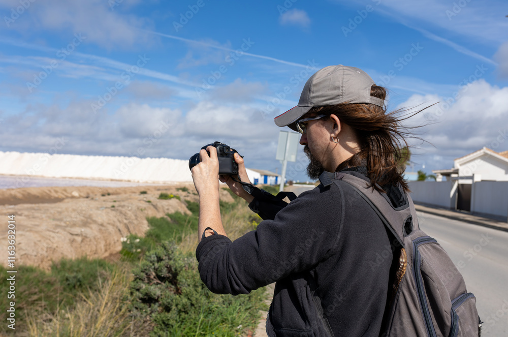 Tourist taking photos at the Bonanza salt flats, Sanlucar de Barrameda, Andalucia, Spain.