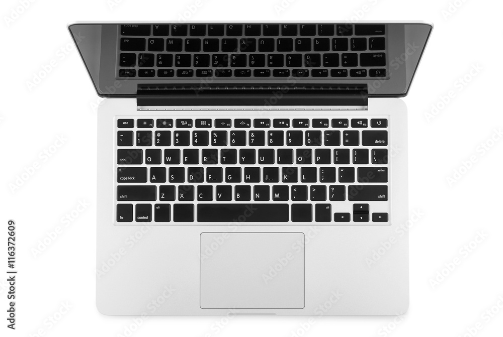 Top view of modern retina laptop isolated on white background, c