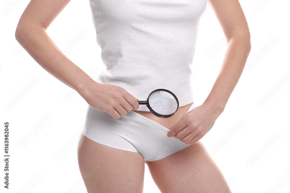 STD (sexually transmitted disease). Woman examining genital area with magnifying glass on white background, closeup