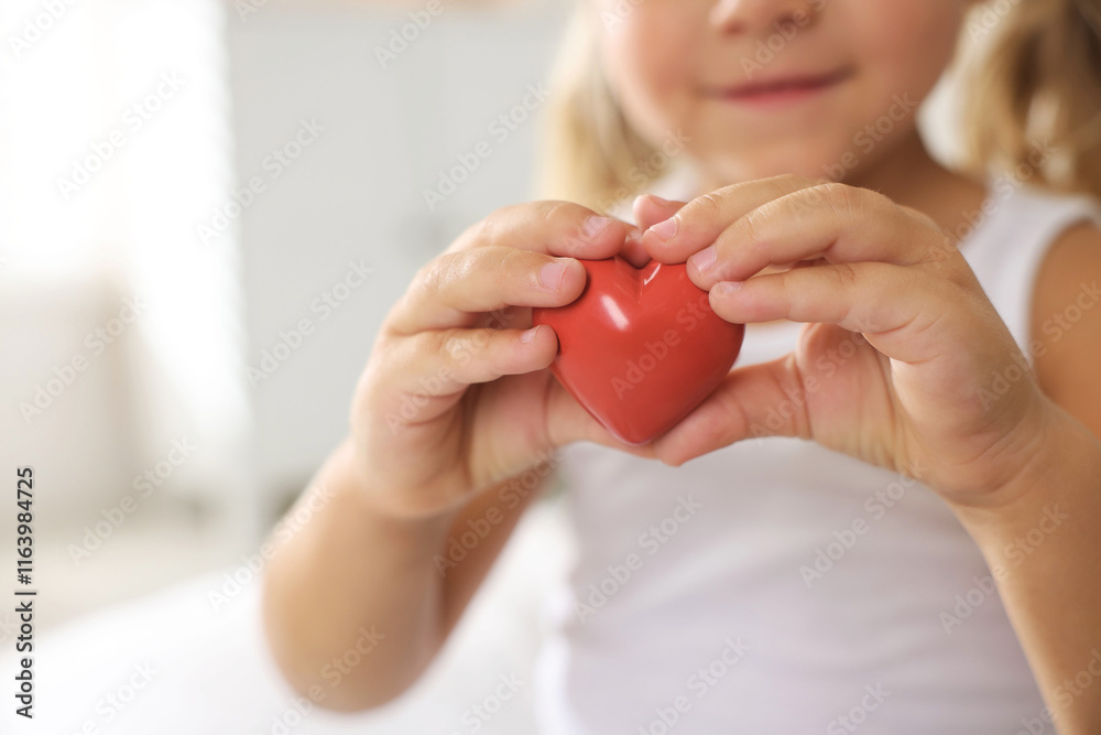 Orphanage concept. Little girl with red heart figure indoors, closeup