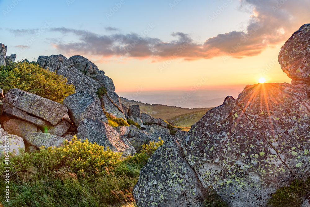 Black Peak (Cherni Vrah) on Vitosha mountain, Bulgaria - 2290 m. Last rays of sunlight through the rocks.