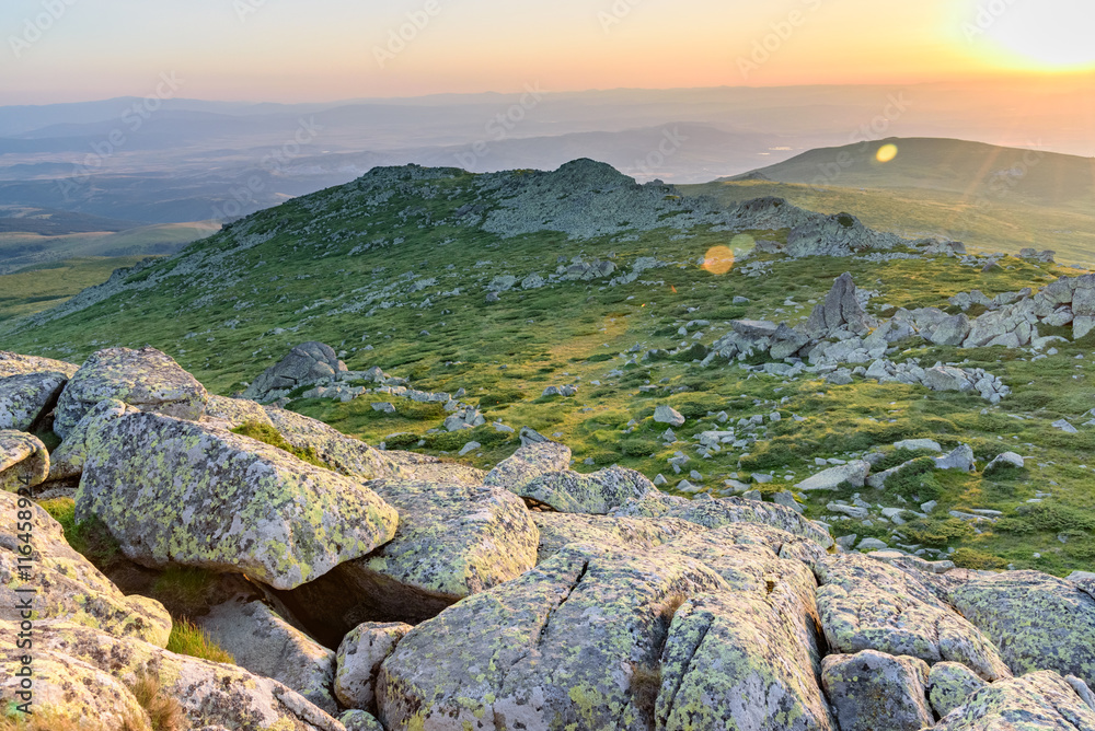 Black Peak (Cherni Vrah) on Vitosha mountain, Bulgaria - 2290 m. Last rays of sunlight through the rocks.