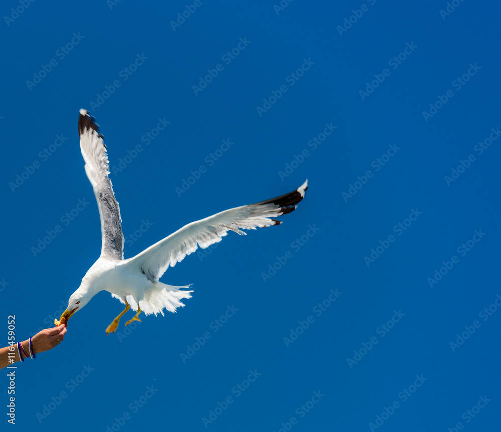 Seagull grabbing food from the hand of a female - at ferry crossing to Thassos, Greece