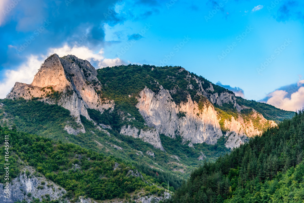 Rhodope mountains, Bulgaria - sunset over the rocks close to town of Laki.Amazing clouds in the sky