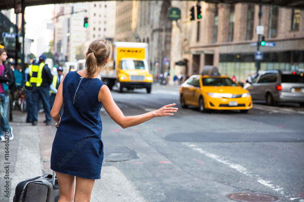 Girl calling/hailking taxi cab on Manhattan, New York City, USA