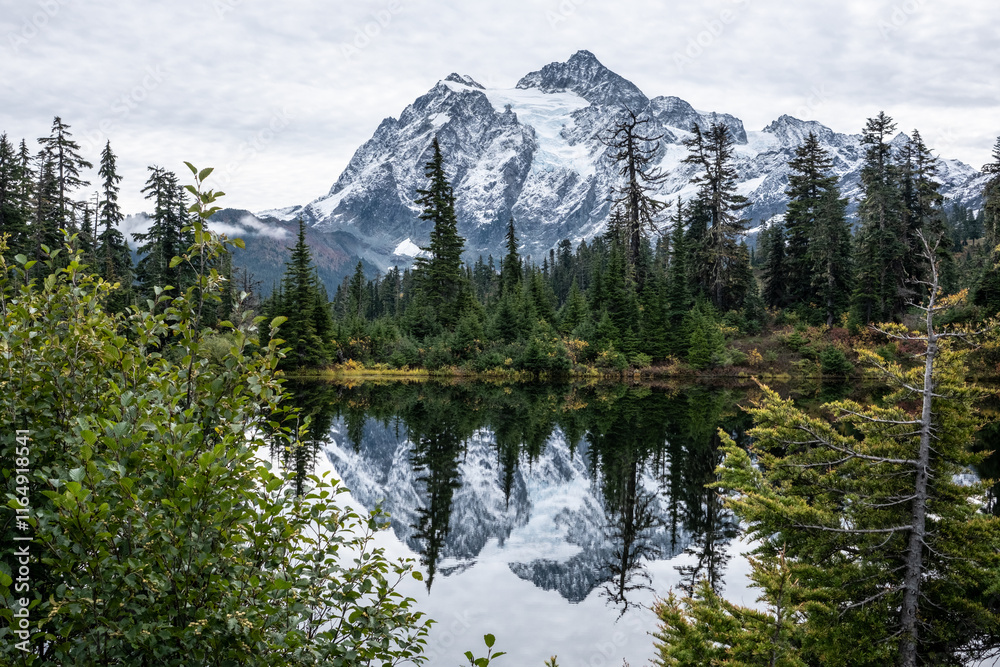 Mount Shuksan with fresh snow perfectly reflected in Highwood Lake
