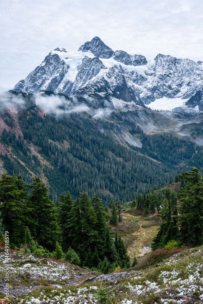 Dramatic Mount Shuksan, forests and trail through Alpine Meadows below