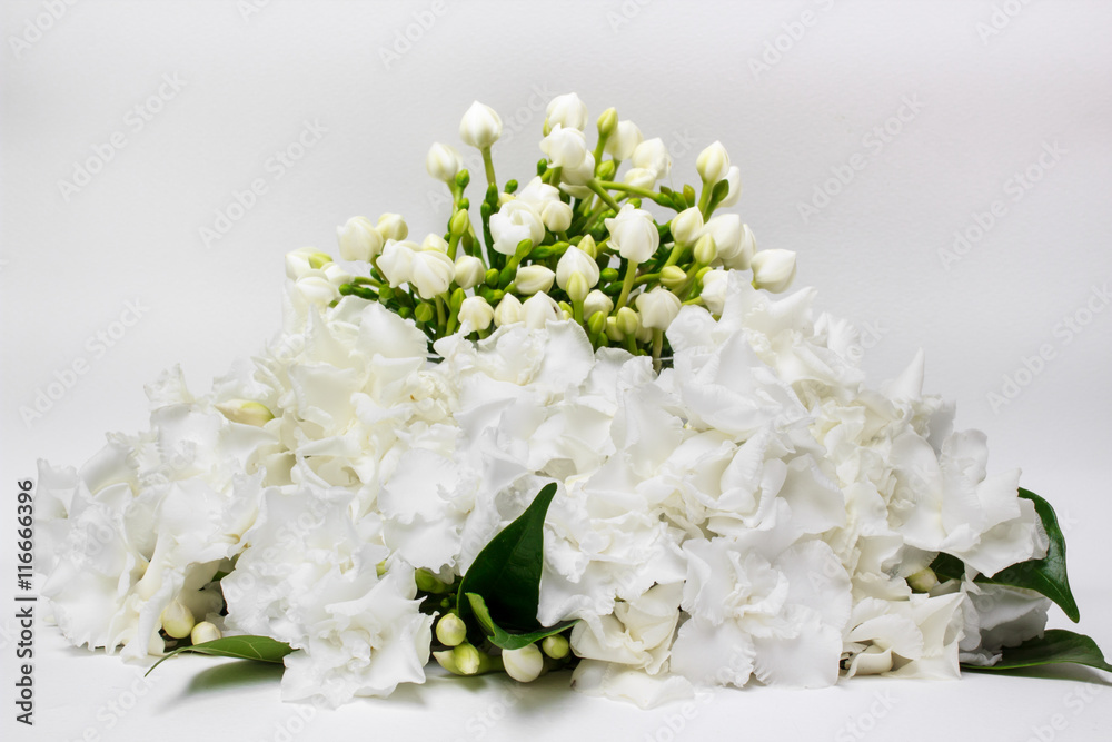 Beautiful bouquet of white Gardenia jasminoides flower or Cape Jasmine with bud, isolated on a white background.