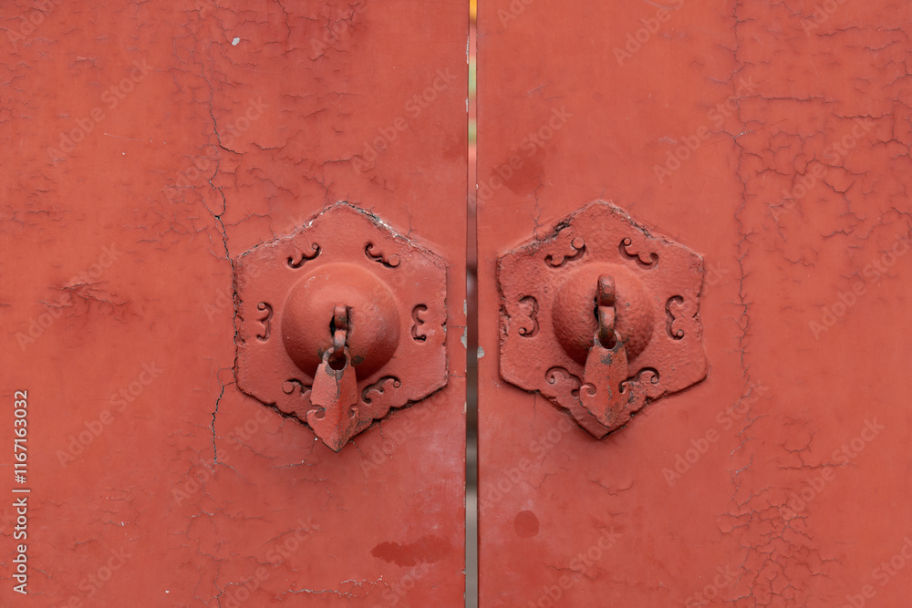 Red wooden door and cymbals of the Forbidden City in Beijing, China