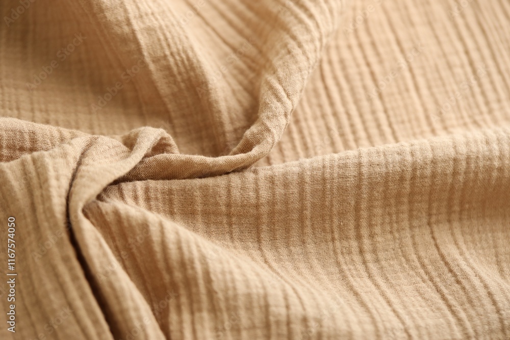 Texture of crumpled linen fabric under natural light in peach fuzz color