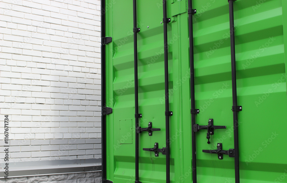 New Locked Shipping Container Near White Wall At Outdoor Warehouse