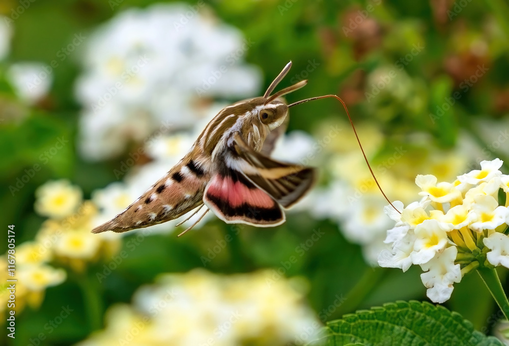 A closeup profile of a White-lined Sphinx Moth with its long tongue or proboscis in a White Lantana flower.
