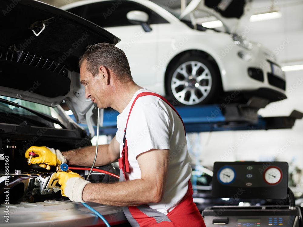 Car mechanic checks the air handling unit of a car