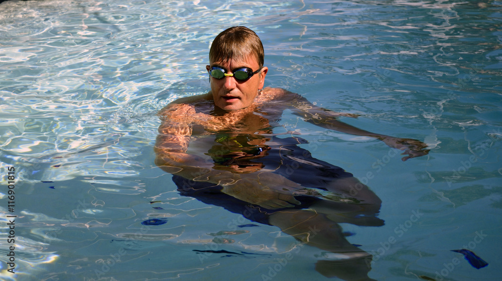 Man treading water in swimming pool wearing goggles.