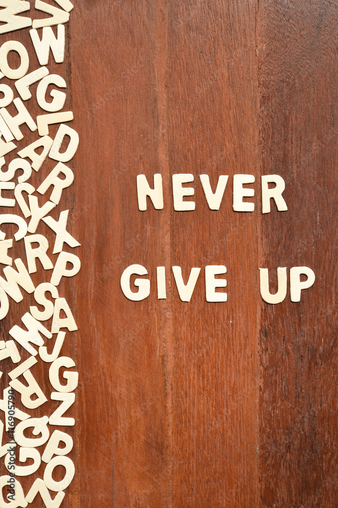 Word never give up made with block wooden letters next to a pile of other letters over the wooden board surface composition
