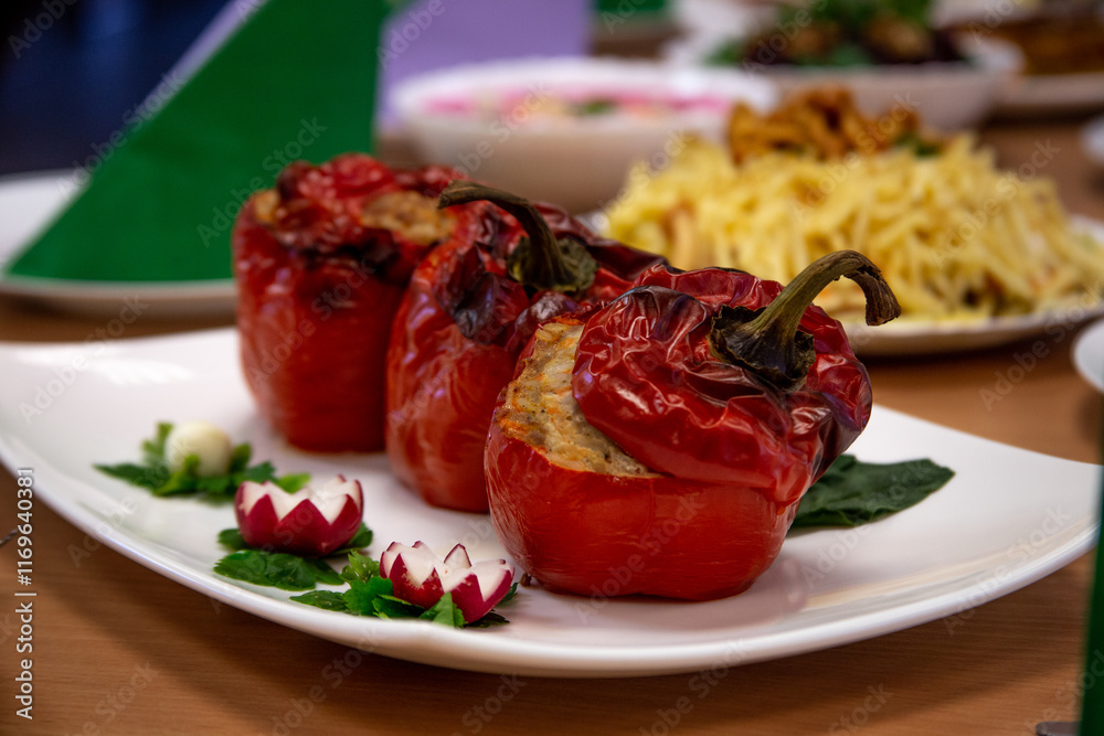 Stuffed Red Bell Peppers with Herb Garnish on White Plate