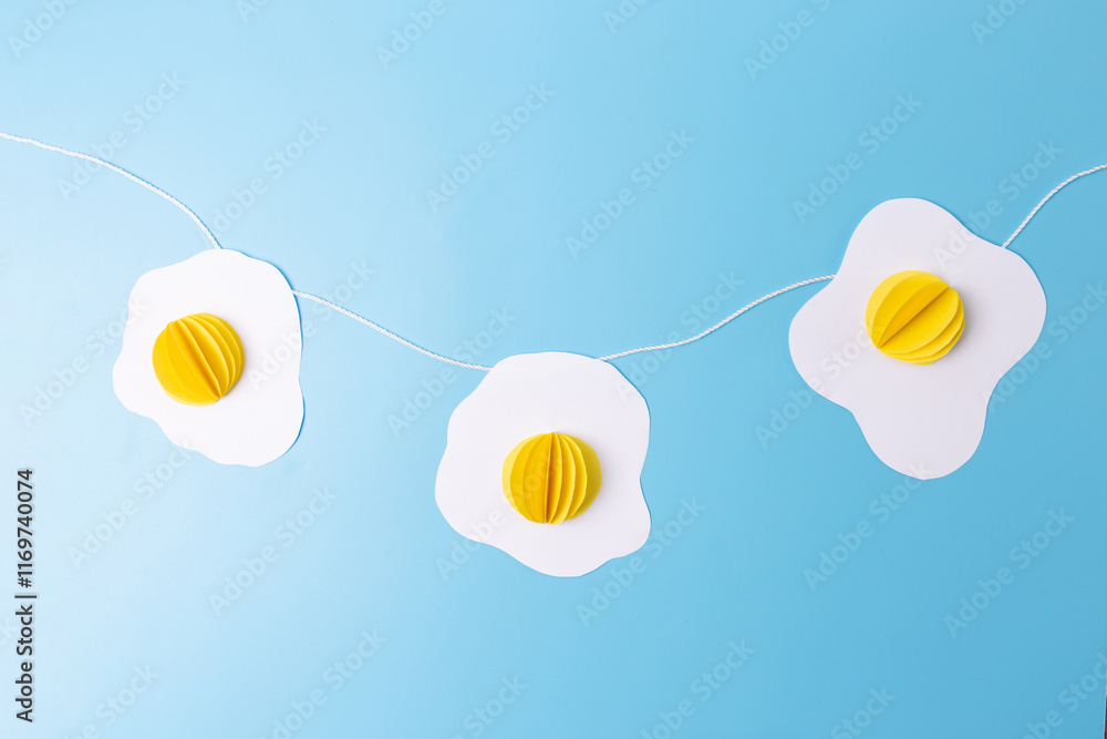 three fried eggs paper craft hanging from a string on a blue background, easter decoration concept,