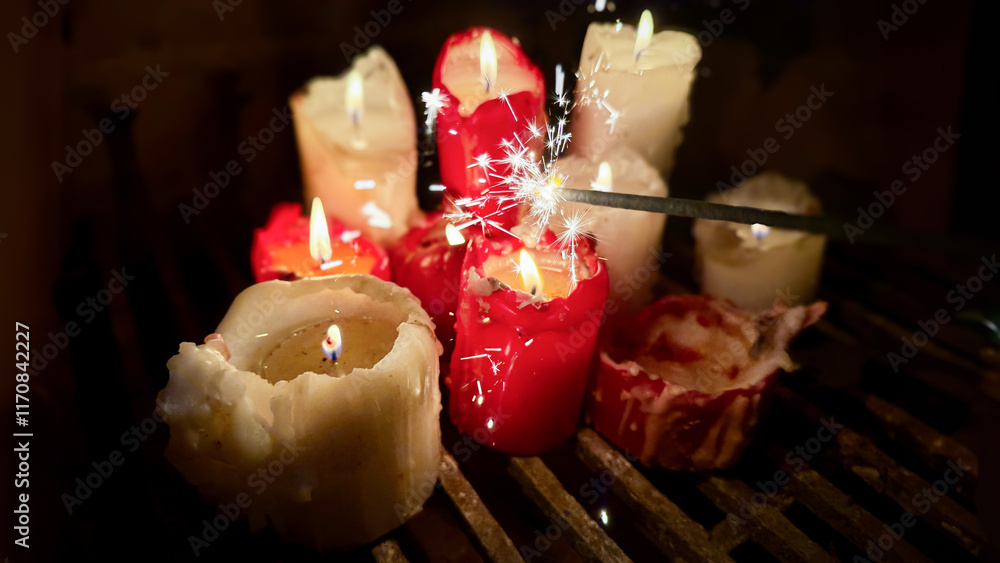 Romantyczne świece z zimnymi ogniami – ciepły blask i magiczna atmosfera. Walentynki. Miejsce na tekst.