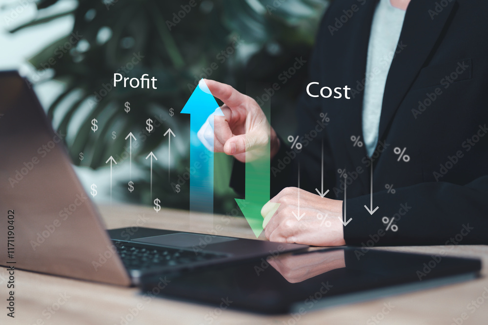 Cost and profit management concept, Businesswomen cost planning of the company, Profit up, Maximize profits and financial, Quality control, Decreasing expense, Long-term investment, Money interest