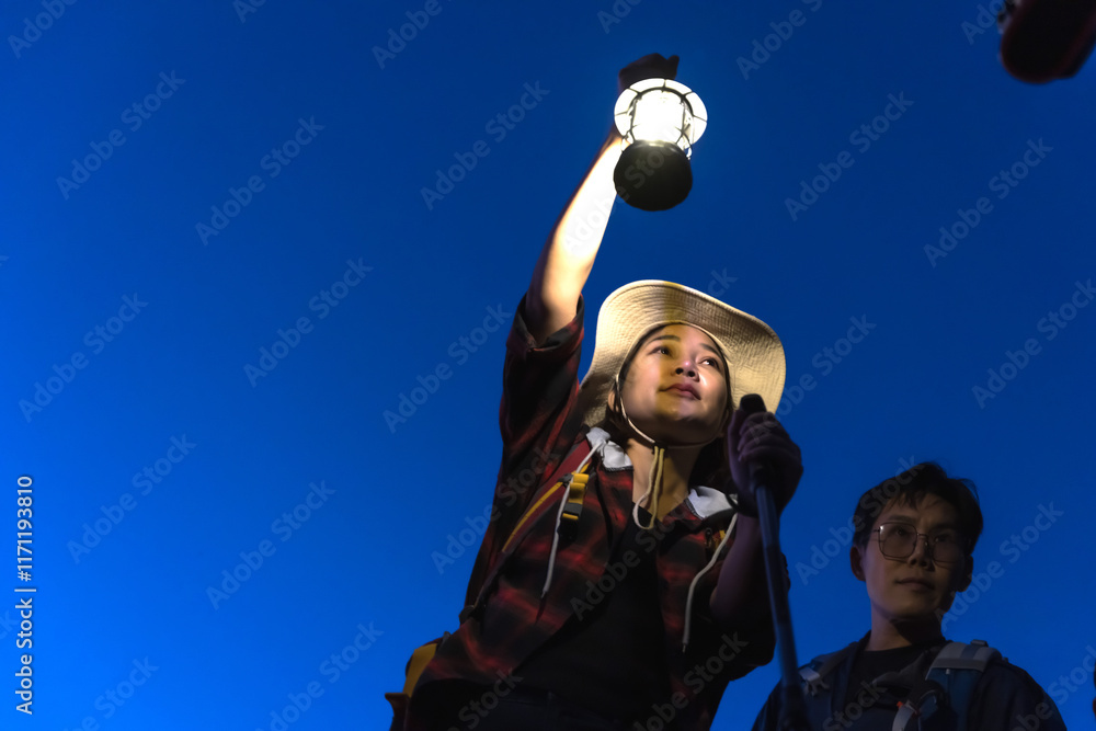 Trekker woman holding camping lamp during hiking at night