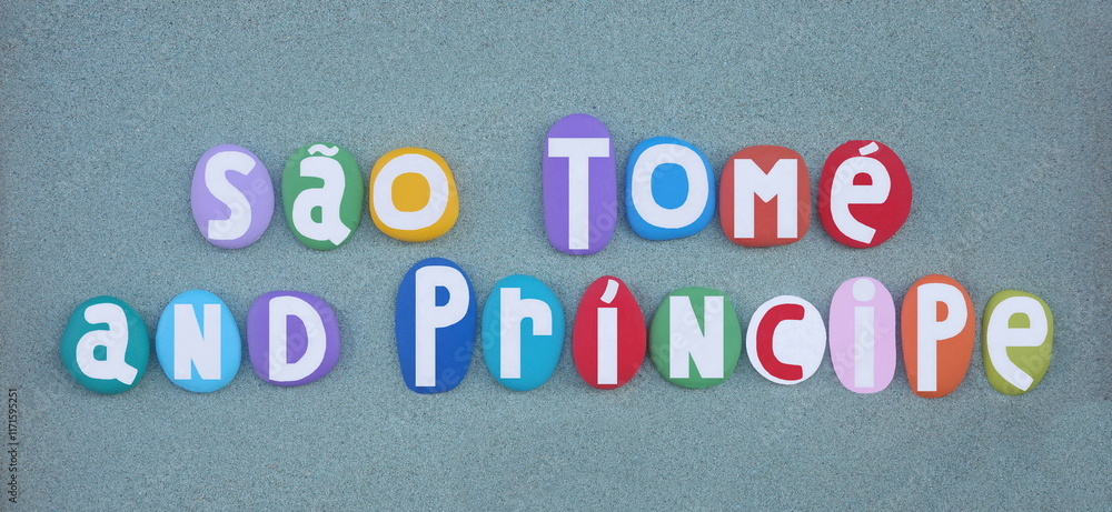 Sao Tome and Principe, island country in the Gulf of Guinea, off the western equatorial coast of Central Africa, creative logo composed with multi colored hand painted stone letters over green sand