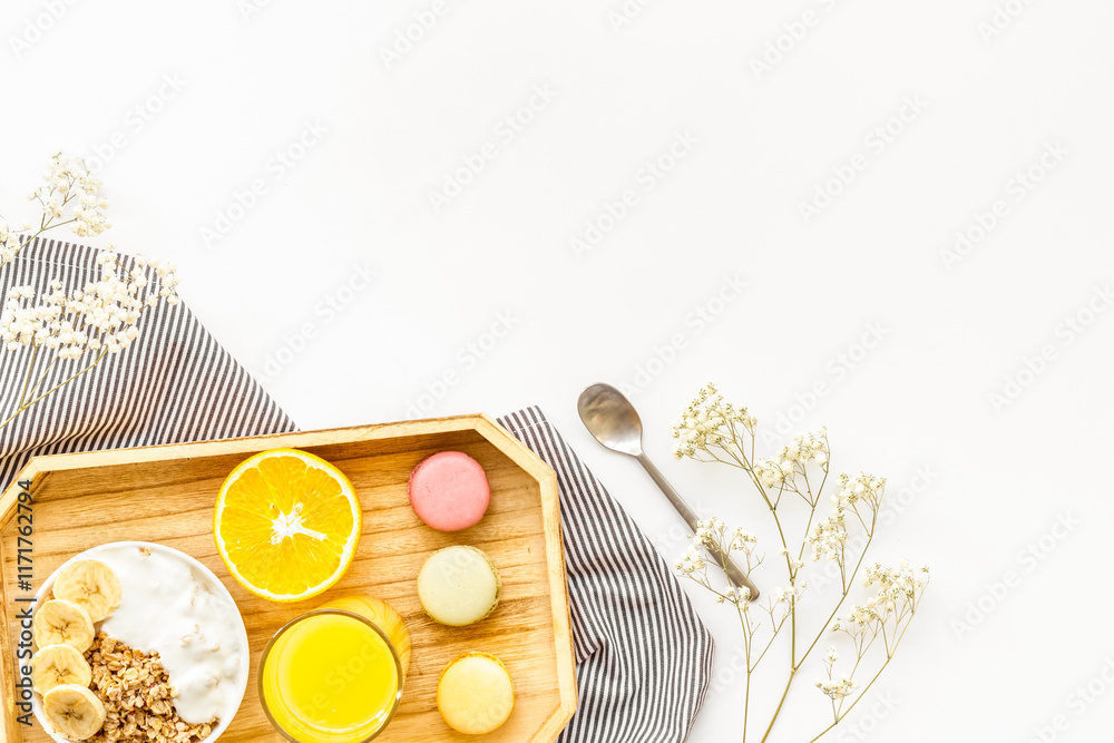 food for healthy breakfast with granola and fresh orange juice on bright white background top view mock up