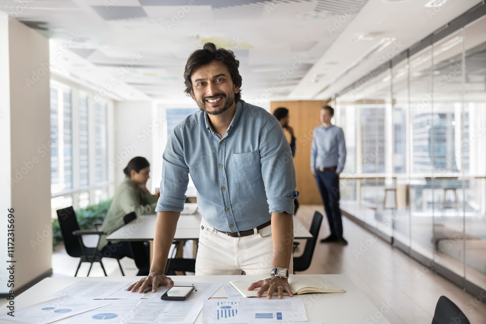 Happy Indian businessman, company owner, executive posing in open office with working team in background, touching table with marketing growth sales reports, looking at camera, smiling for portrait