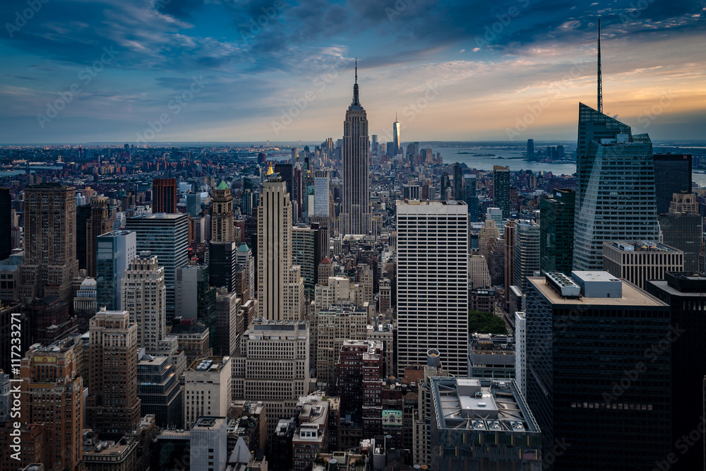 Aerial view of midtown Manhattan at night, the heart of a financial empire that dominates the business world, with every building vividly colored in shades of blue and green in NYC, state of New York