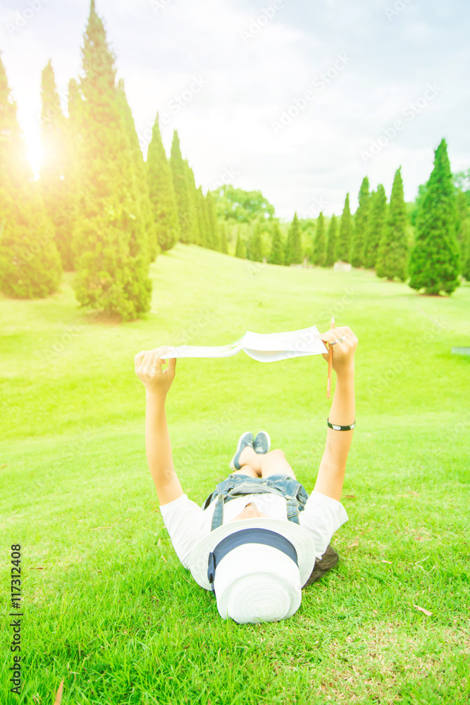 young woman sitting on the grass and reading the book