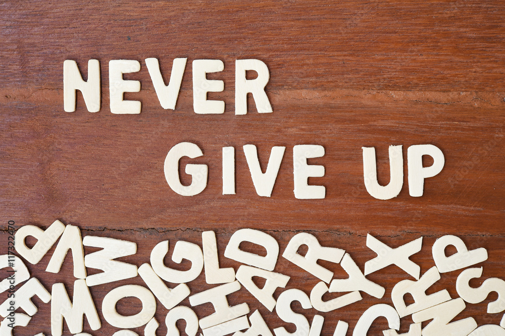 Word never give up made with block wooden letters next to a pile of other letters over the wooden board surface composition