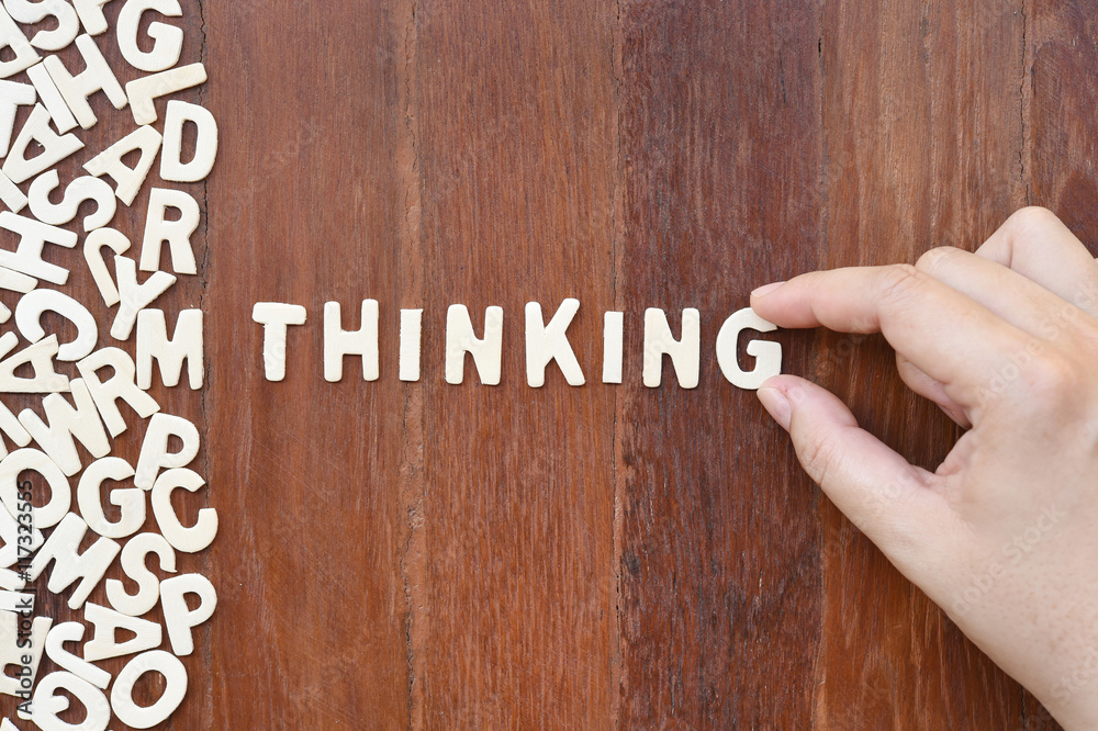 Word tinking made with block wooden letters next to a pile of other letters over the wooden board surface composition