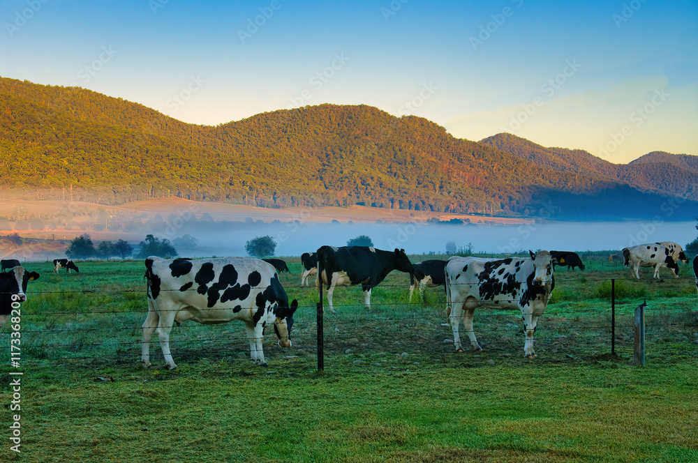 Black-and-white cattle on a meadow bounded by forested hills. Early morning mist in the Kiewa Valley, in the alpine region of Victoria, Australia