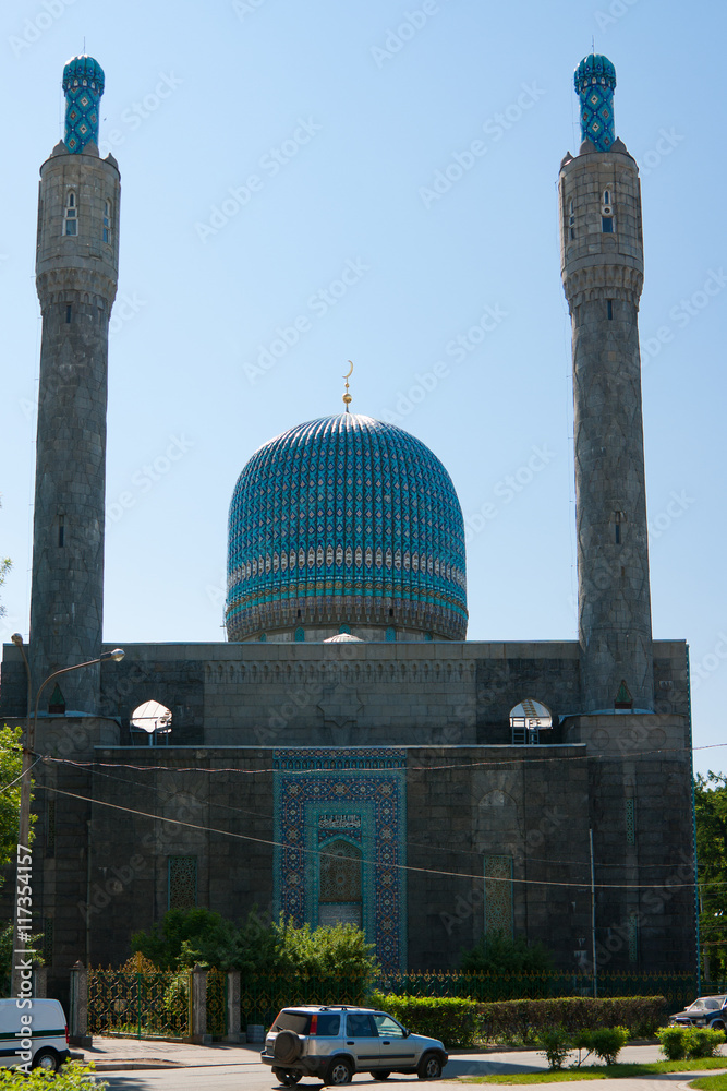 The cupola of St. Petersburg's cathedral mosque on the blue sky background. Ceramic pattern.