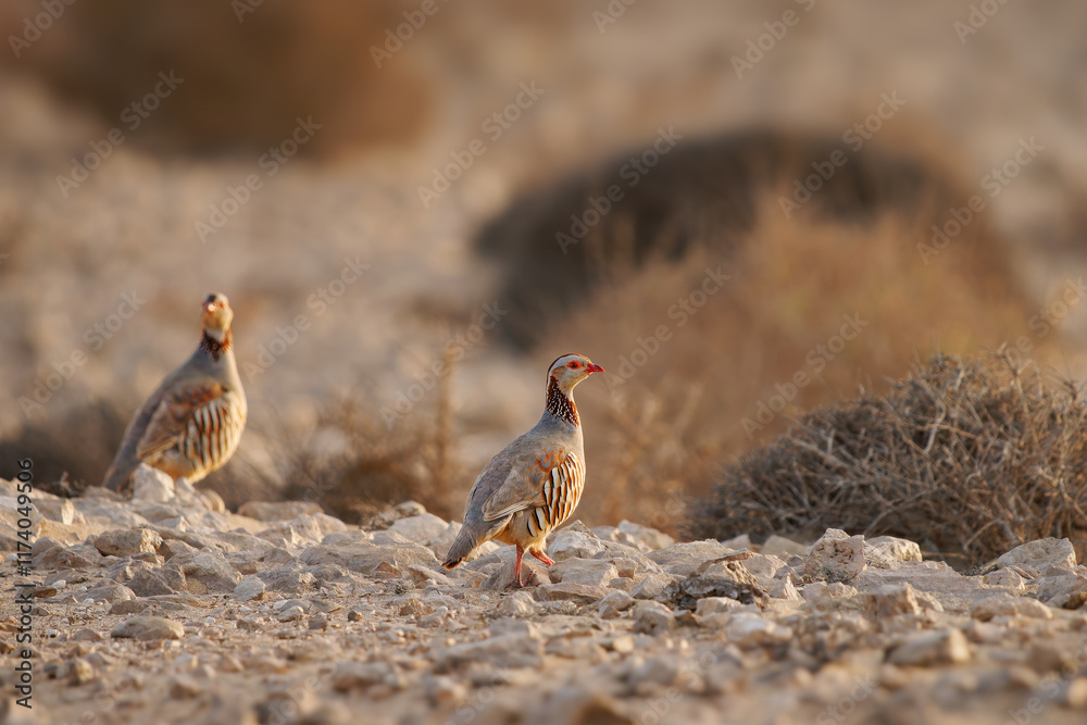 Barbary Partridge - Alectoris barbara is gamebird in pheasant family Phasianidae of Galliformes, native to North Africa, living also on the Canary Islands, several birds in the Fuerteventura desert