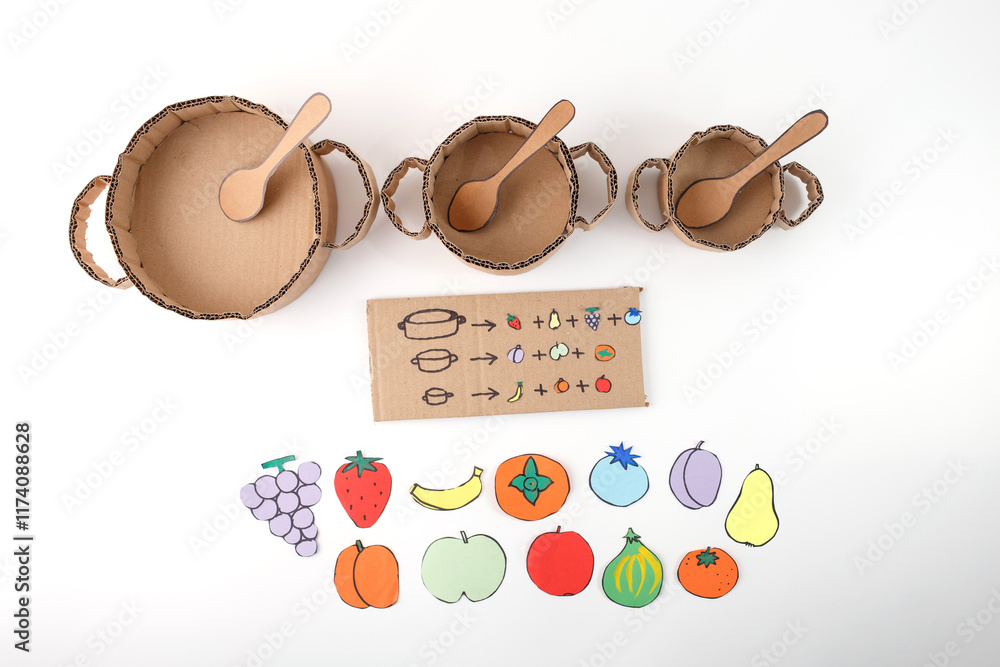 Cardboard pots and spoons with paper fruits and crafting instructions. Flat lay composition on a white background. Fruit crafting and DIY concept. Design for education, poster, and invitation, play