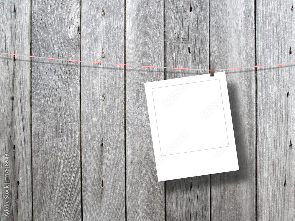 Close-up of one blank square instant photo frame hanged by peg against gray wooden boards background