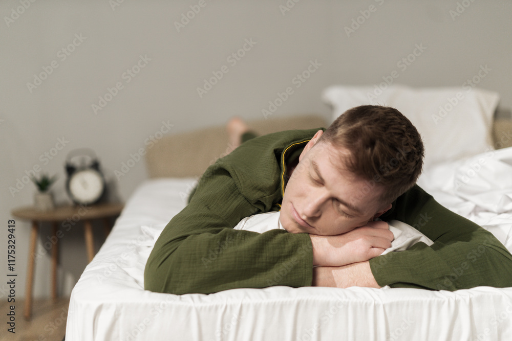 Man is sleeping on a bed. There is a clock on the left side of the bed