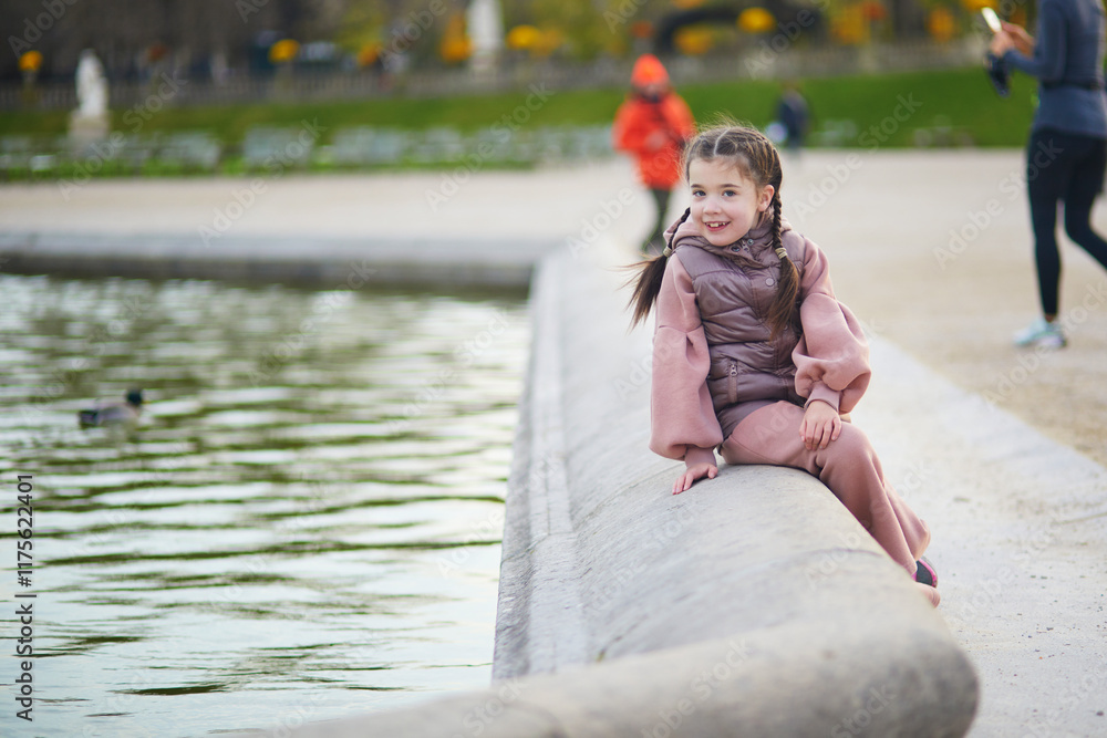 Adorable little girl having fun on a fall day in Luxembourg garden of Paris, France