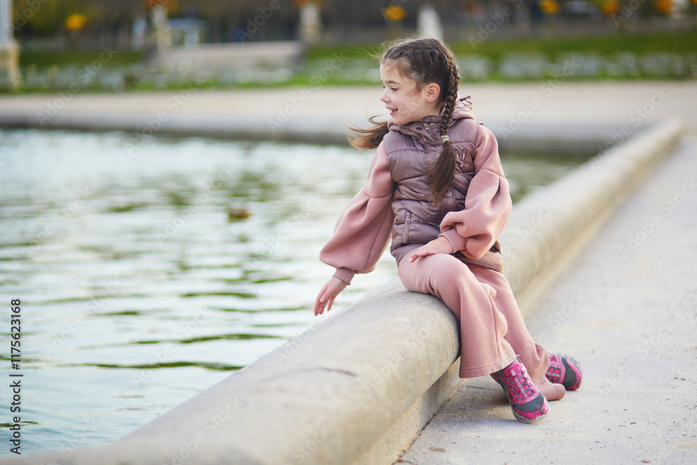 Adorable little girl having fun on a fall day in Luxembourg garden of Paris, France