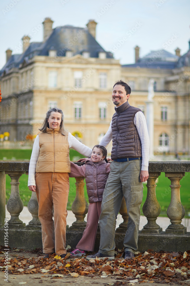 Happy family of three, father, mother and daughter enjoying family time together in Luxembourg garden of Paris, France.