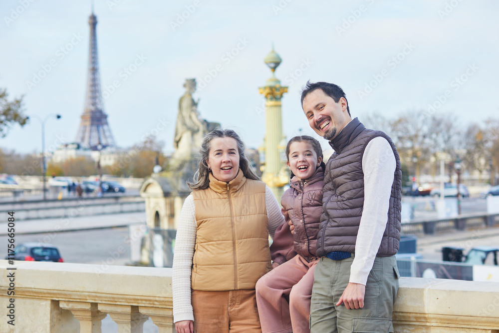 Happy family of three, father, mother and daughter enjoying family time together in Luxembourg garden of Paris, France.