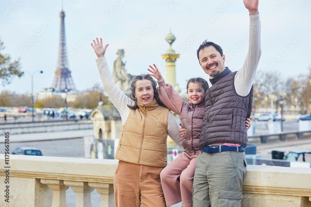 Happy family of three, father, mother and daughter enjoying family time together in Luxembourg garden of Paris, France.